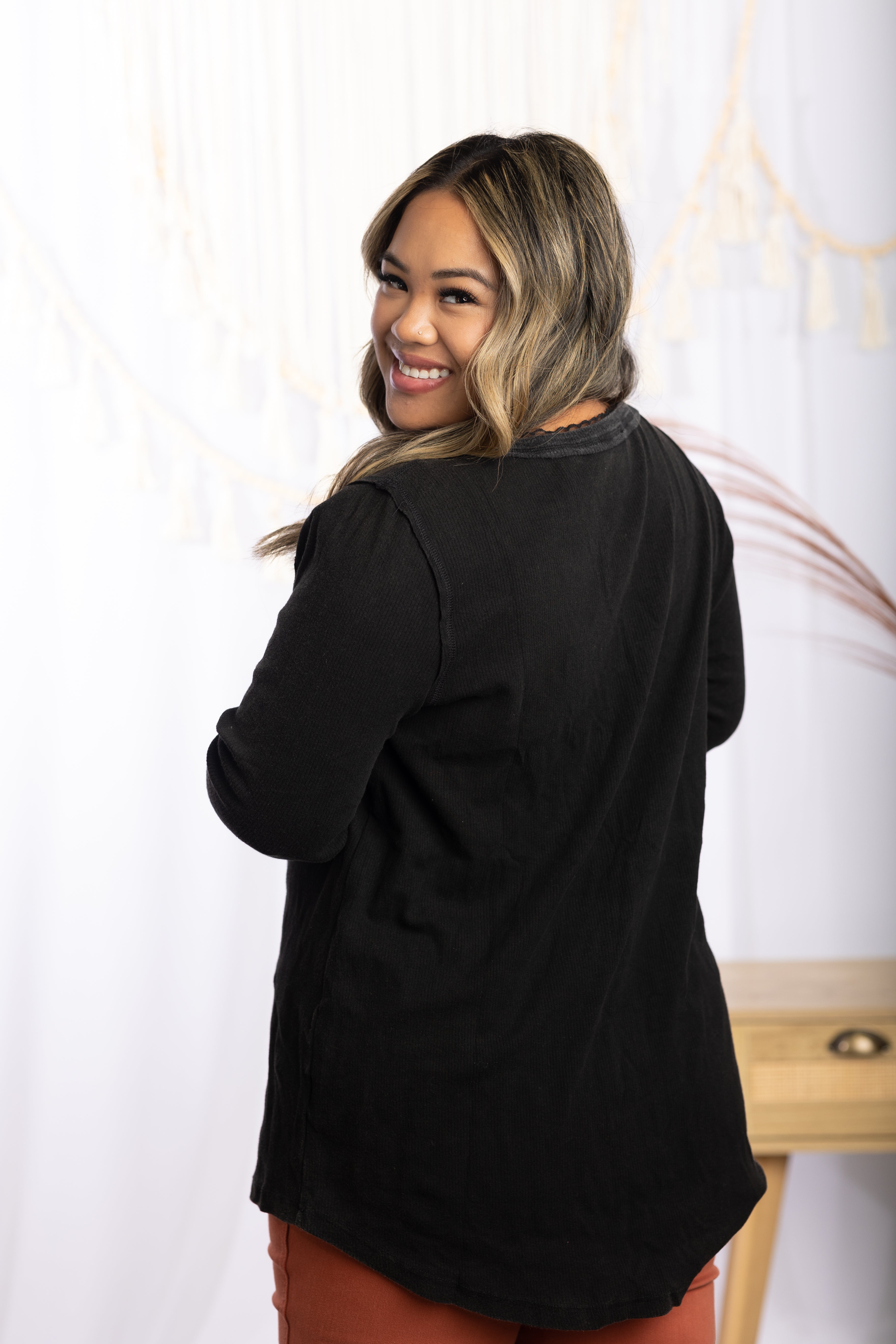 Everyone loves a henley, and this one takes the cake..it will absolutely become your forever go to piece. Made from a heavy knit fabric, this top features a scoop neck with functioning buttons, reverse stitching details and lace trim on the neck and sleeves.