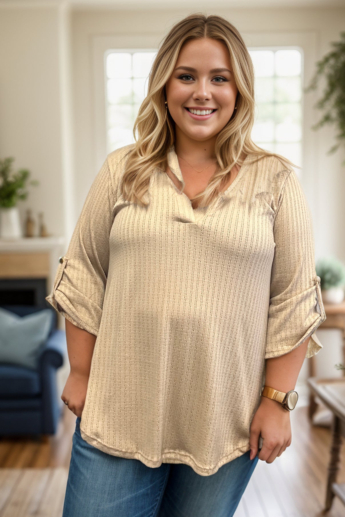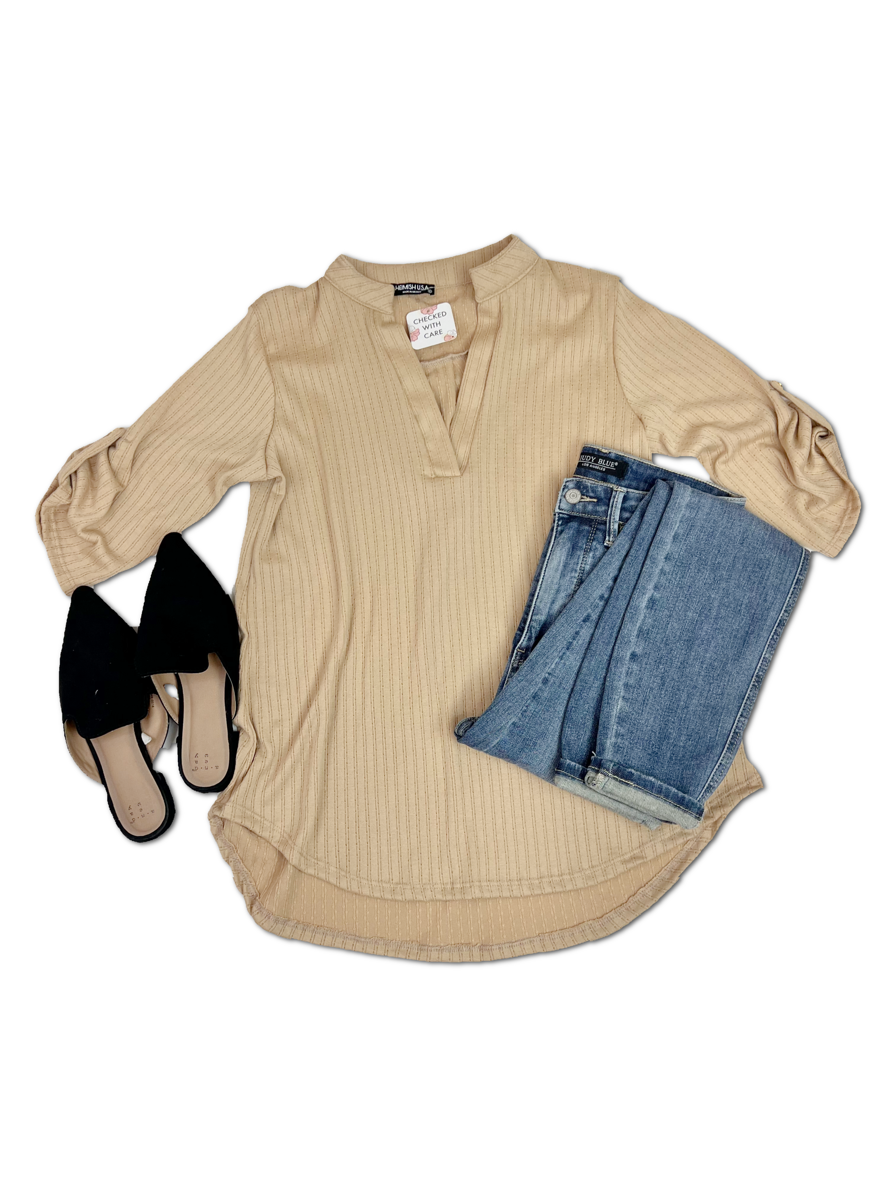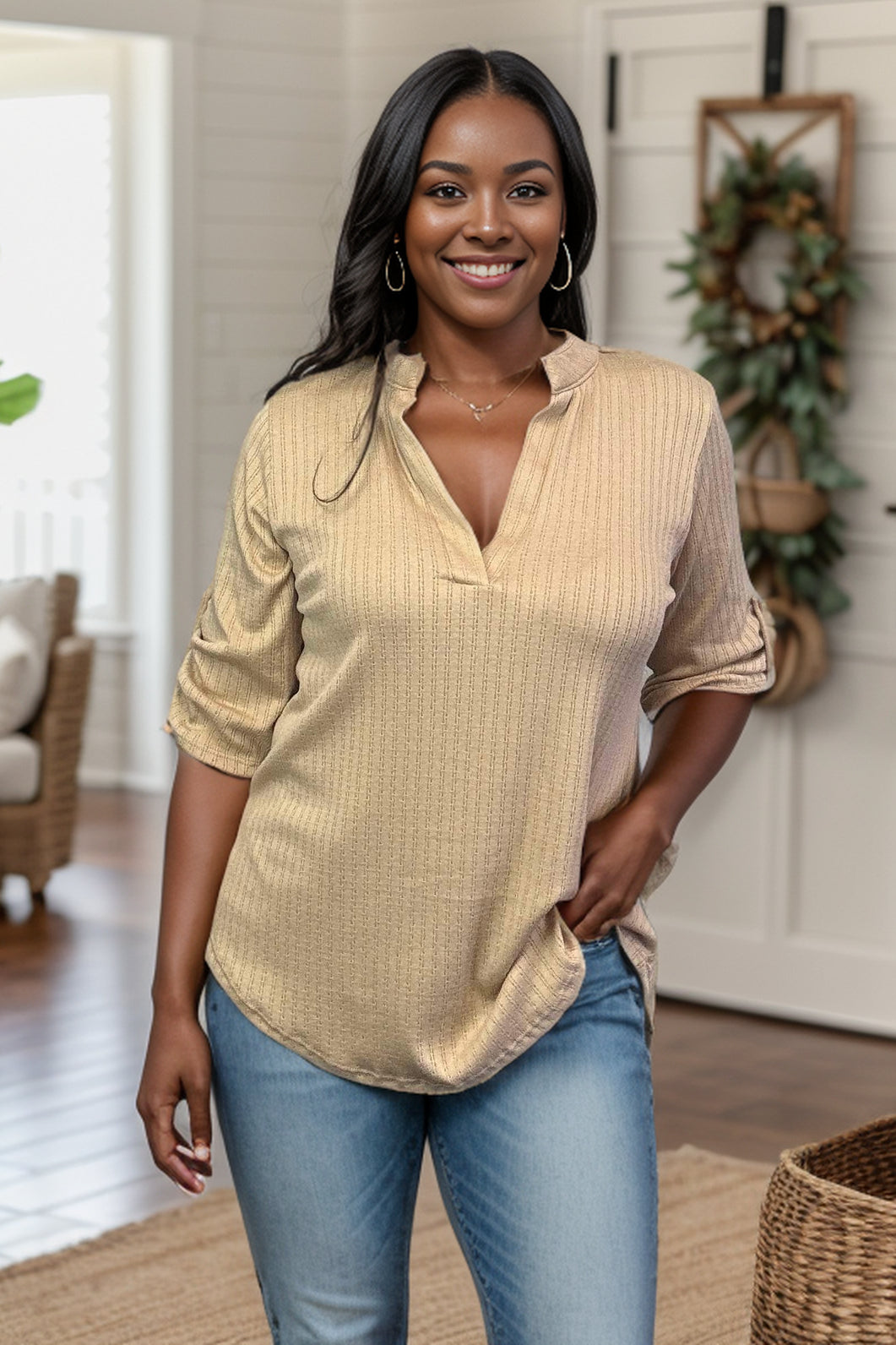 Get ready for days like no other in our Days Like This Gabby! Featuring a roll-up 3/4 sleeve, v-neck, and mandarin collar, this solid colored top will add a touch of style to any ensemble. Perfect for a fun night out!