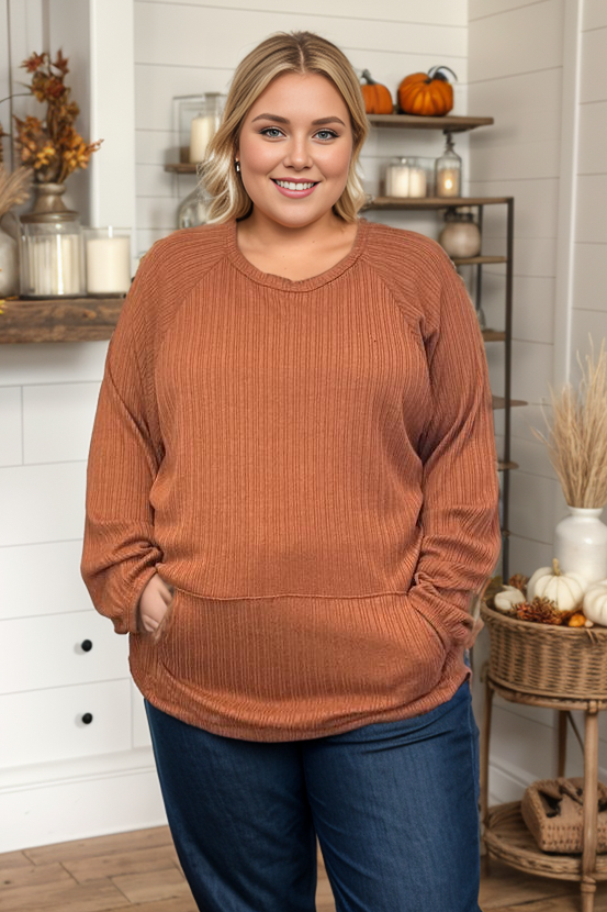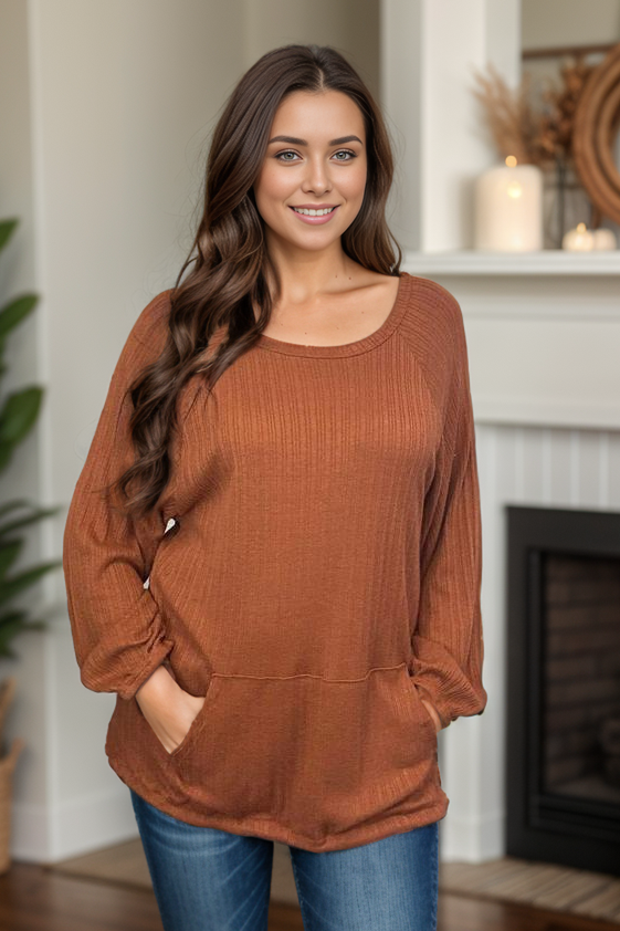 Get cozy and stylish in our Rustico Pullover! With a round neckline and textured fabric, this pullover is both soft and on-trend. The long sleeves and self tie hem make for a relaxed fit, all in a bold rust color that will surely make a statement.