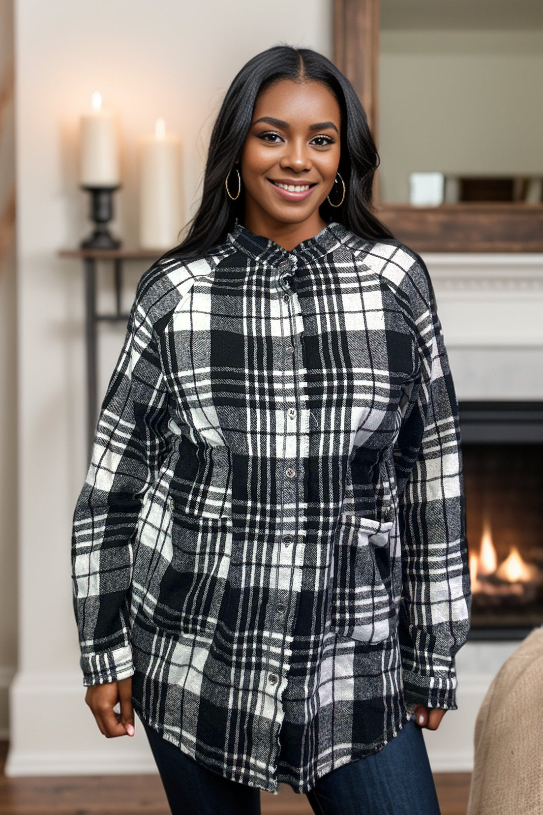 Add this black and white plaid flannel to your wardrobe- it'll make you the talk of the town! With a button down style, mandarin collar, frayed hem, and inner waist drawstring, you'll stay cozy and stylish all day. And don't forget the front pockets, perfect for carrying your essentials. Thought you should know!