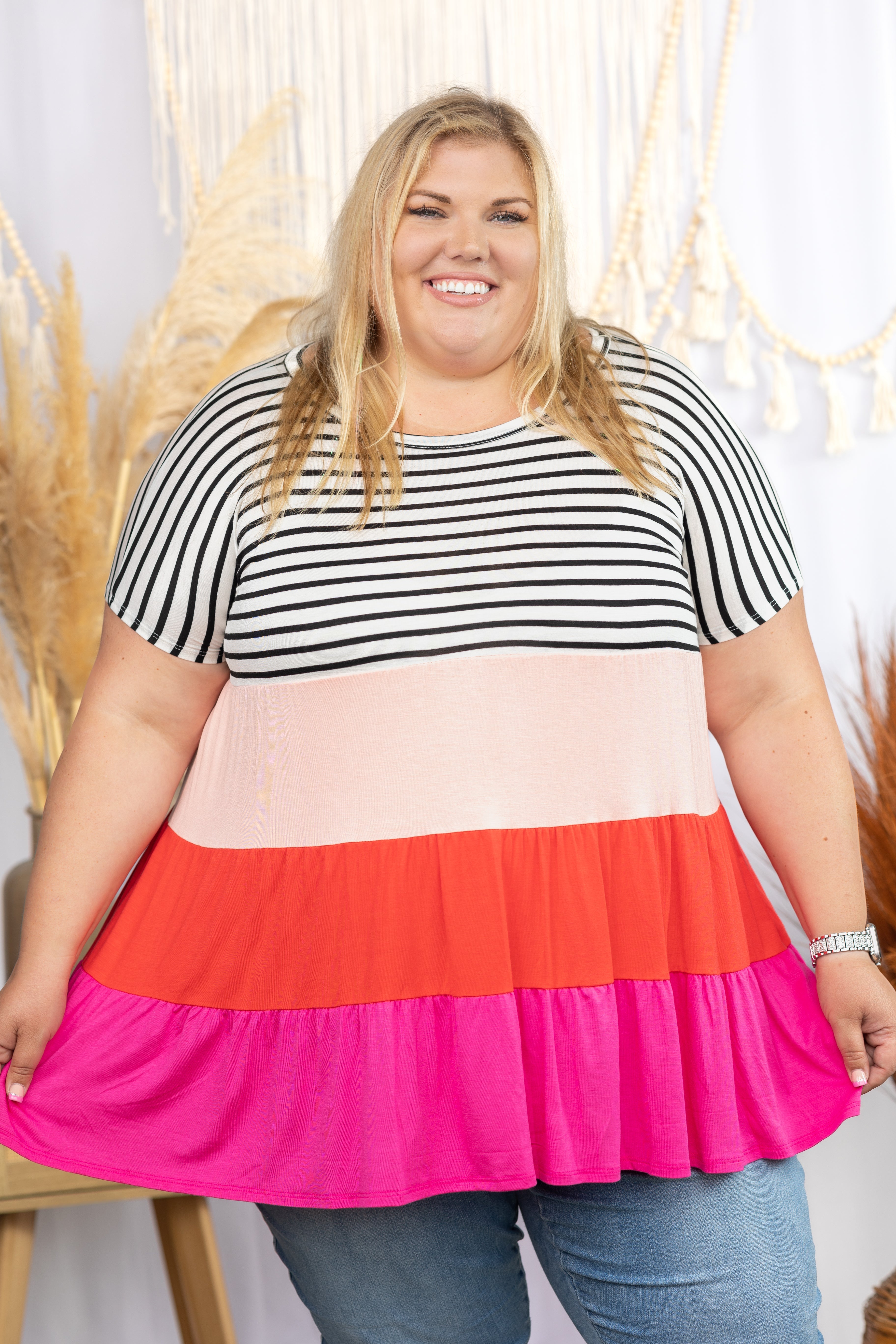 Show your love of fashion with our Tiered Love Tunic! Featuring a eye-catching colorblock design and a dreamy tiered ruffled hem, this top is sure to turn heads! Comfortably stylish with its round neckline and short dolman sleeves, this top is ready to take your wardrobe to the next level!